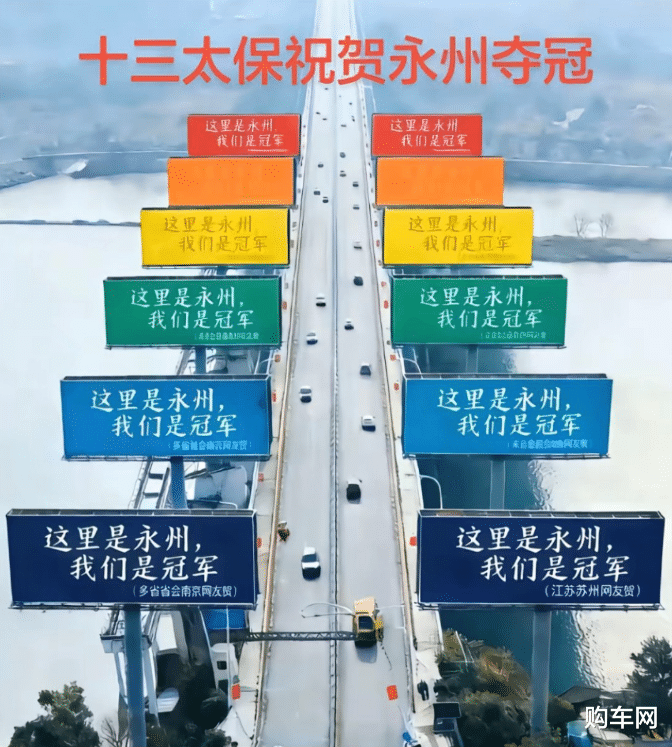 更让人感动的是,这份热爱还跨越了地域。夺冠后,江苏苏州一位球迷自费 为永州队制作了祝贺广告牌,竖在永州队主场附近。消息一出,江苏 “十三太保” 各市球迷纷纷跟进,盐城、南京、泰州等地的助威广告牌陆续亮相永州街头,成为跨省为体育呐喊的名场面。而广汽埃安的加入,让这份支持从 “自发热爱” 升级成了 “专业助力”。