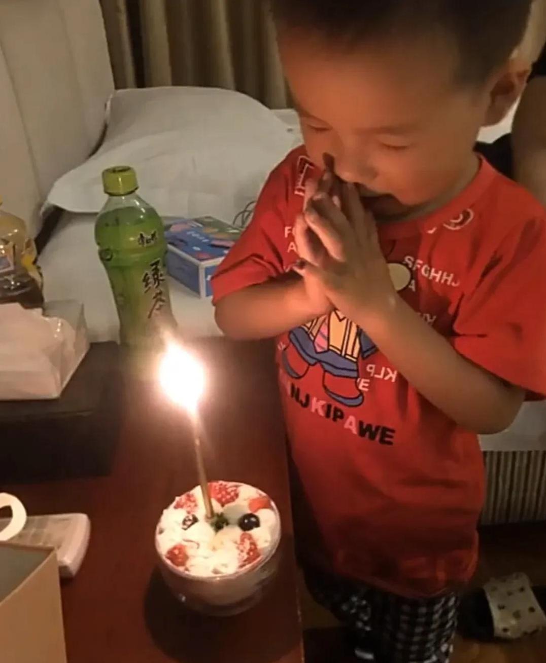蛋糕小得只能插上一根细细的蜡烛,但儿子却仍然一脸满足,对着蜡烛开心地许愿。