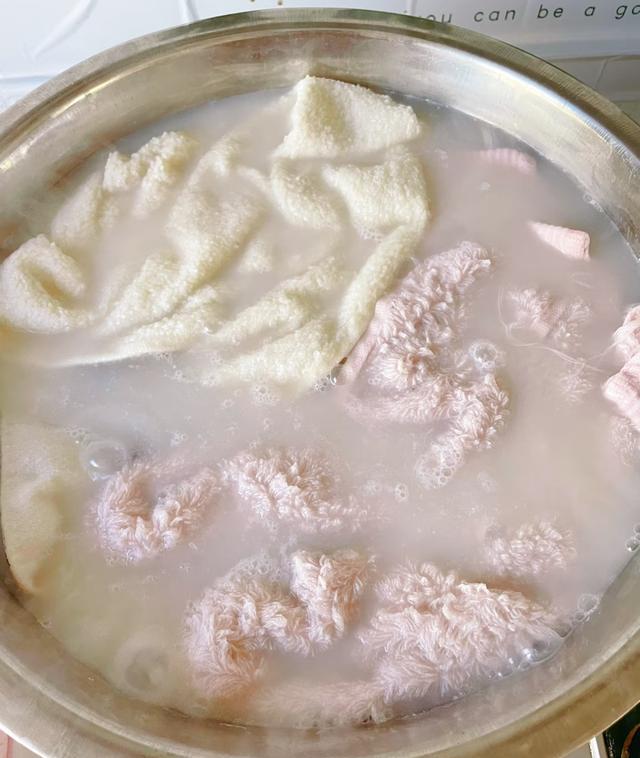 用热水浸泡肥皂,或者刮一些肥皂碎末,热水化开,然后将脏脏的毛巾抹布浸泡进去,根据脏污的程度,浸泡半小时到几个小时不等。