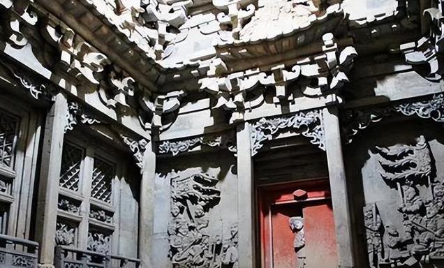 更让人惊叹的是,在一个角落里竟然雕有戏台的景象,不过最引人注目的还是在一扇朱红色大门旁的砖雕一位妇人微微探出头来,就好像正在向外张望。