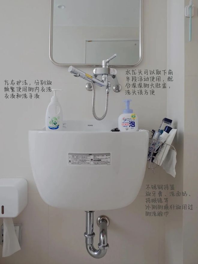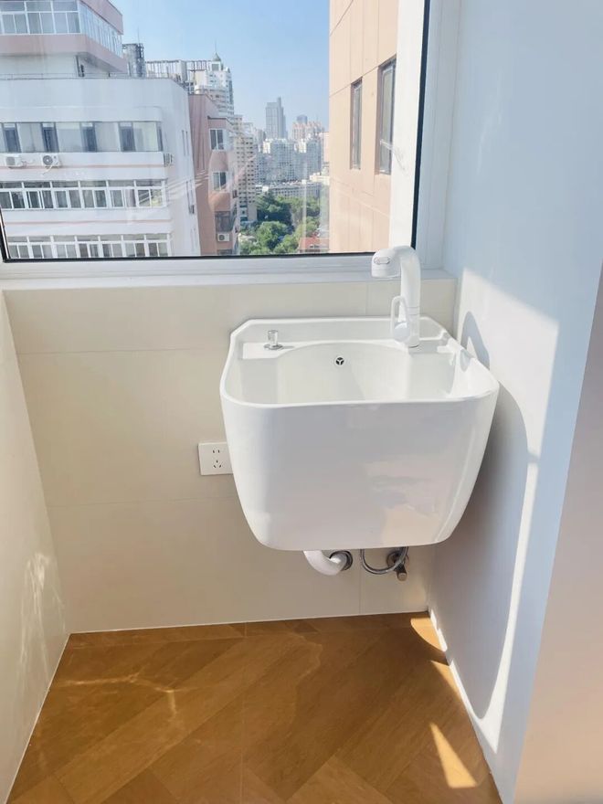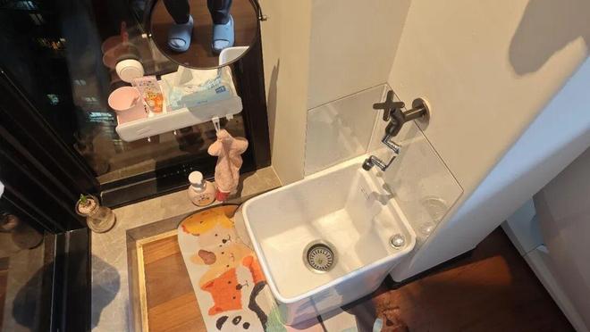 3)洗漱区:若平时有泡脚的习惯,还可以将拖把池安装在洗手台下方,宽度有个40cm就够了。