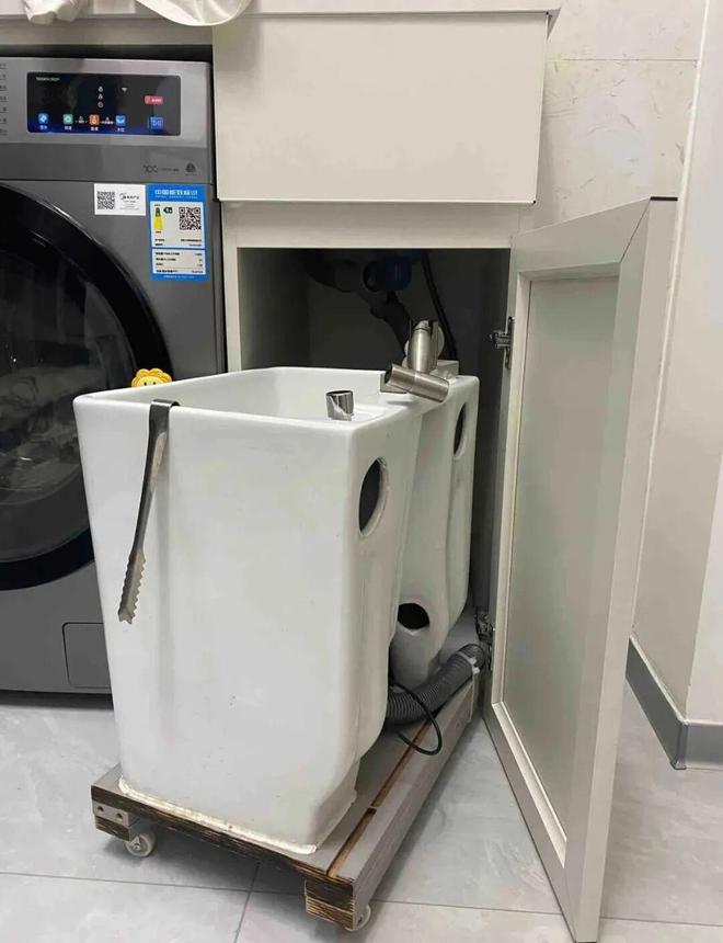 而年轻人就想到了一个绝妙点子,用拖把池代替泡脚盆,可直接放热水,用完把水一放就完事,简直不要太省心。