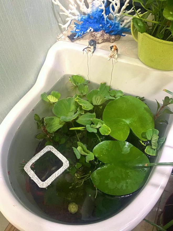 如果你家的拖把池彻底用不上了,平时又喜欢养点观赏鱼,增加生活的趣味性,那就用拖把池改个生态鱼缸吧。