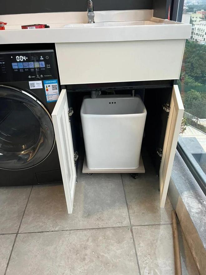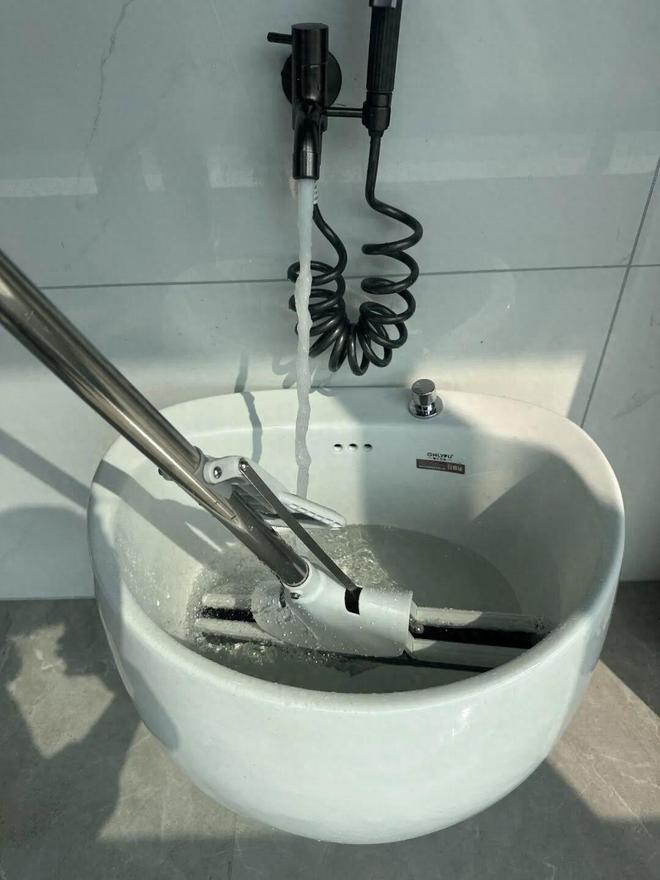 与其去找一个较深的台盆,不如直接用拖把池代替。首先,它的深度足够,可以牢牢把水花“兜”住。