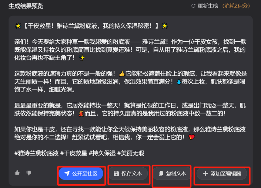第三步,点击【开始创作】,稍等20s就能看到生成结果啦~可以选择保存文本、复制文本、公开至社区等。