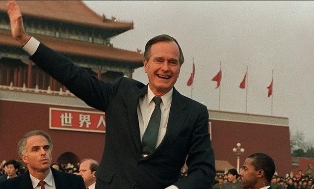 他打破以往美国总统的惯例绕开日本和欧洲,直飞北京,并在天安门广场向群众挥手致意,尽管当时中美关系因国际局势趋冷,但老布什坚持表示,中美合作不是选择,而是必然。