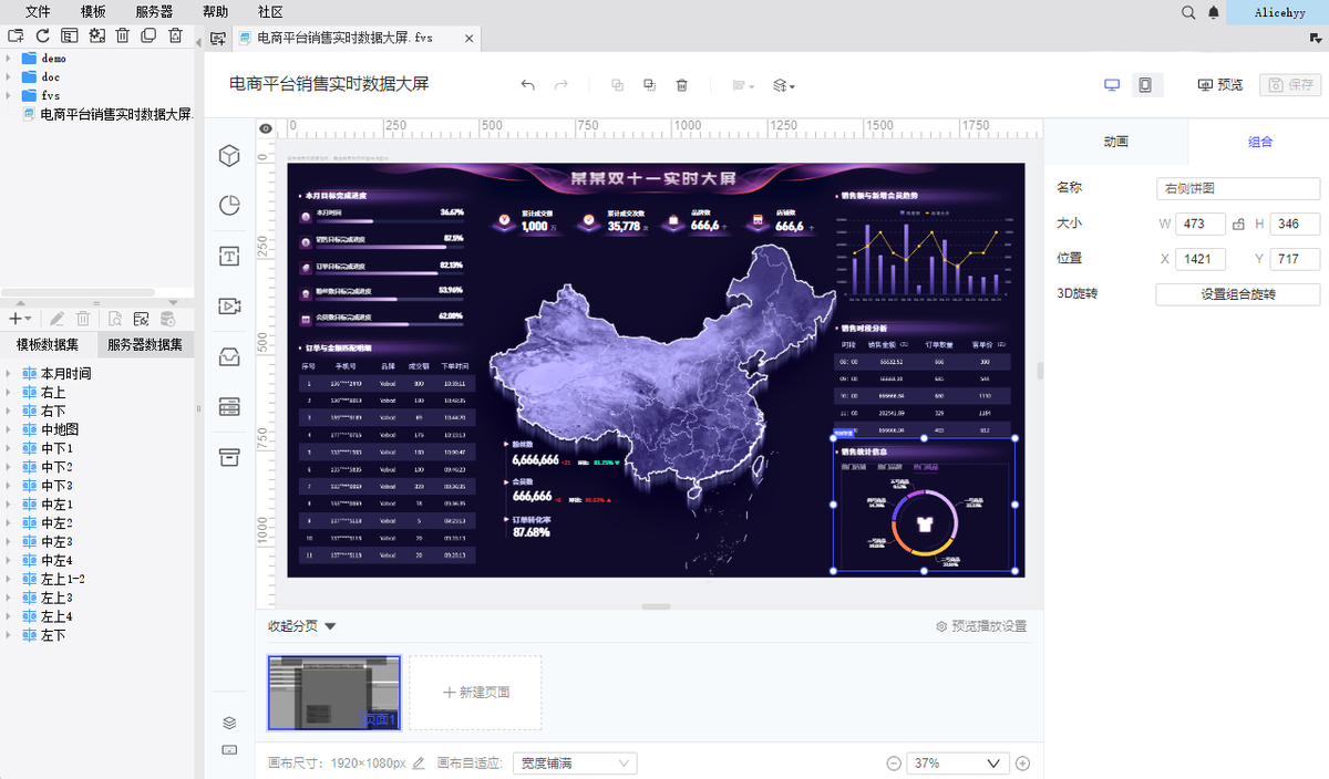 三、决策报表这是给领导看的驾驶舱模式。不同于前两种的格子界面,决策报表是画布式操作,把表格、图表、控件当成积木,拖拽摆放就能做出管理看板。