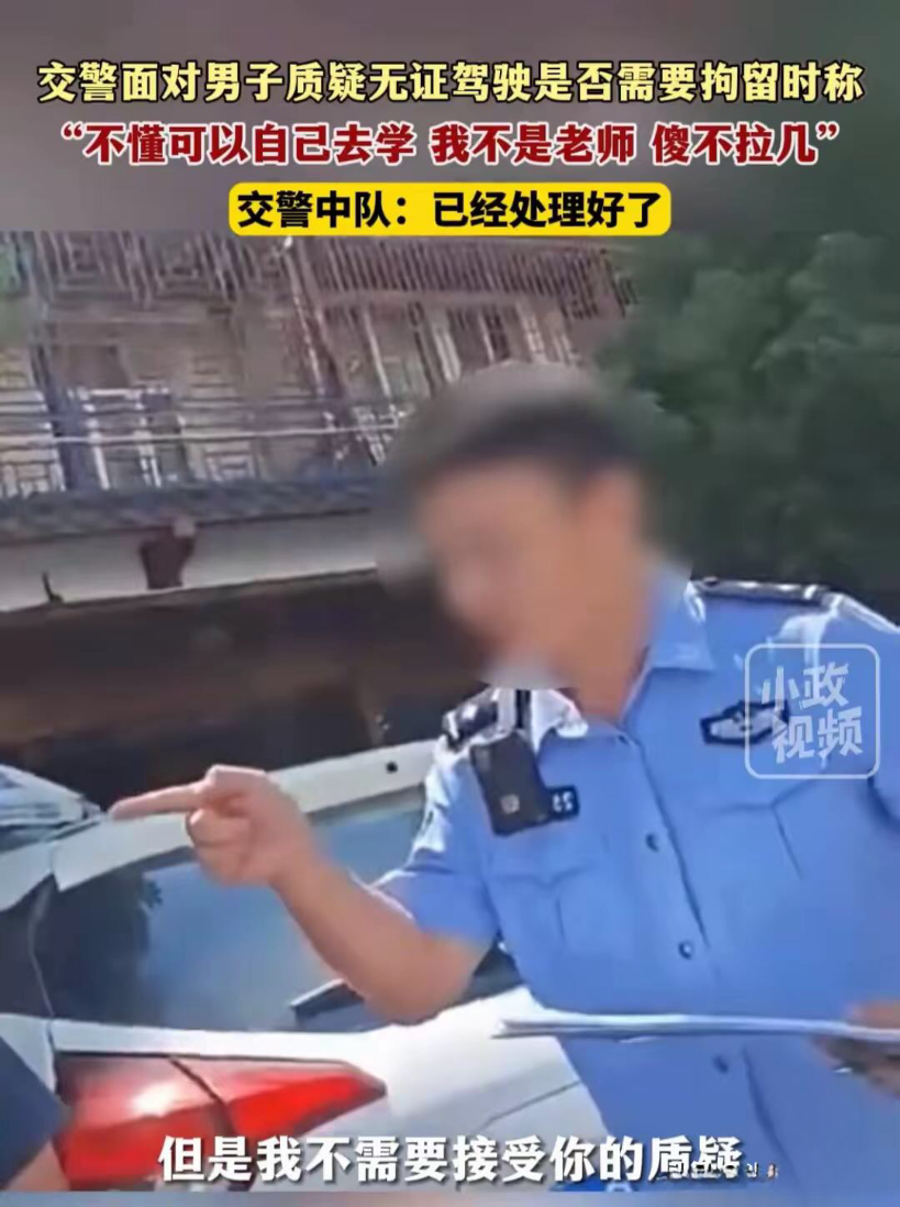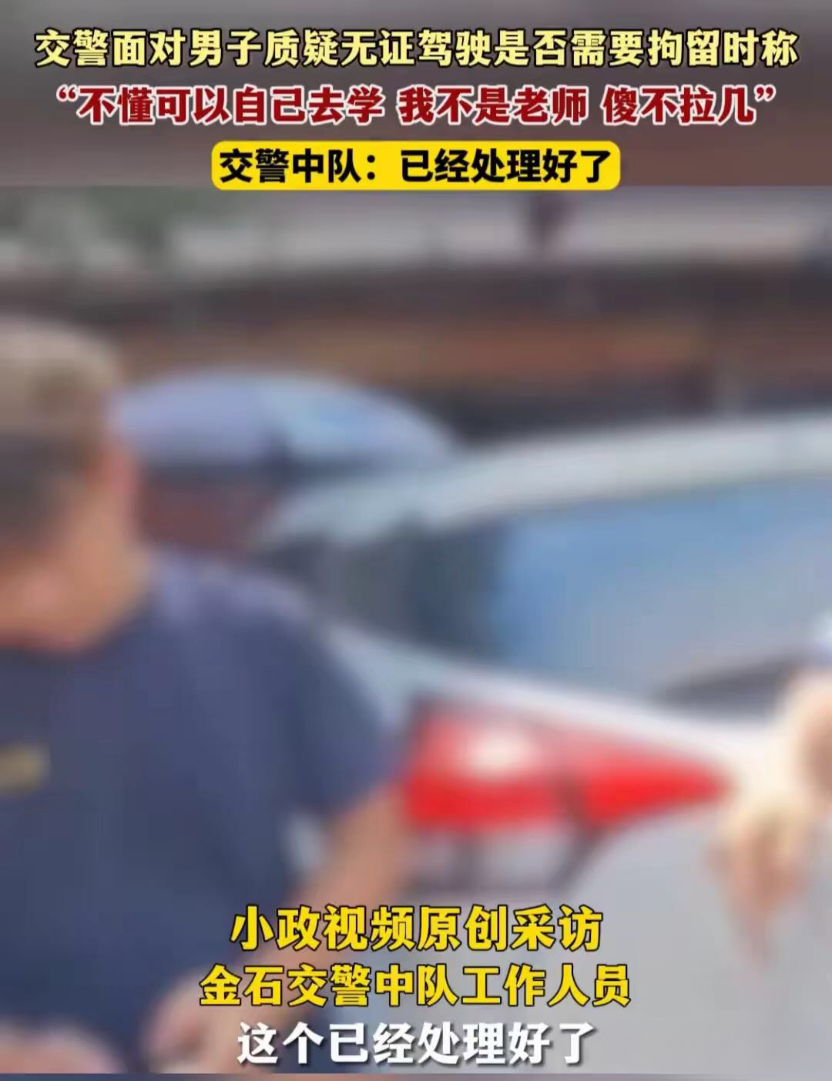 交警似乎有些不耐烦,继续问:“无证驾驶就要拘留吗?”男子感到奇怪,质疑:“那如果无证驾驶没被你们发现,是不是就不追责了?”此时,交警的态度显得更加粗鲁:“你去查查法律吧,我不是老师,我接受你的监督,但不接受你的质疑,听懂没有,傻不拉几!”
