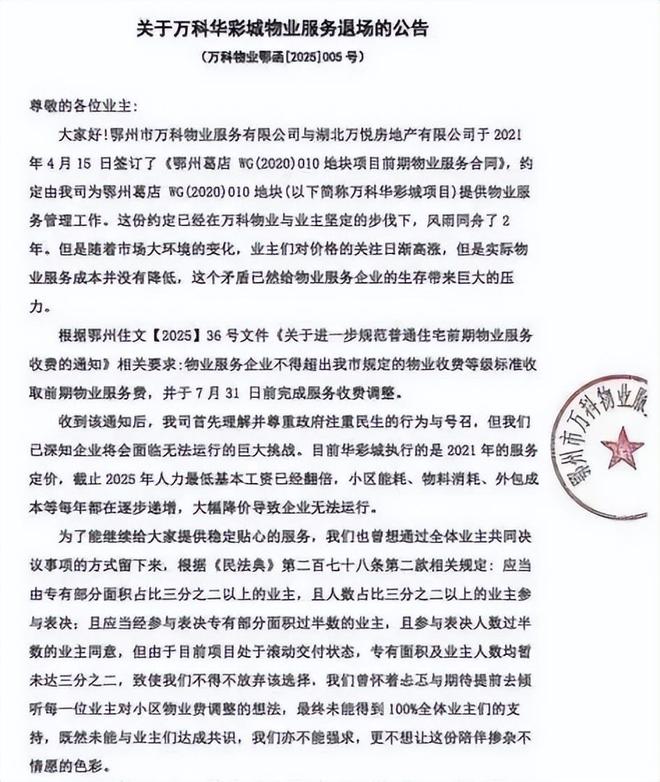 武汉某小区的业主群,突然流出一则物业公司撤场的公告,表示将于2025年12月底正式退出小区的物业服务工作。