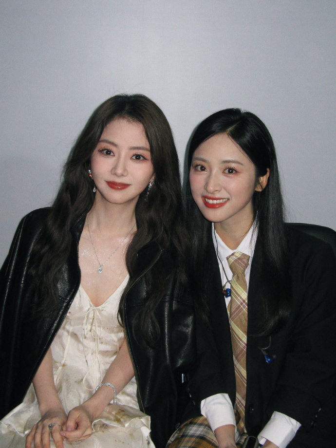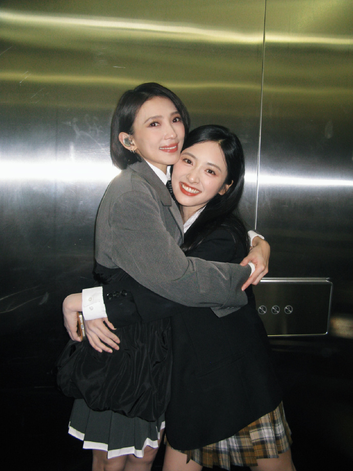 她换了件黑色西装外套,翻领布料带着哑光质感,里面搭了件浅杏色吊带,细肩带贴着锁骨。旁边女生穿了同款西装,还系了条浅棕色领带,两人的头轻轻靠在一块儿,她嘴角弯出浅弧,背景的灰色墙面没什么装饰,却衬得这帧合影的松弛很真切。
