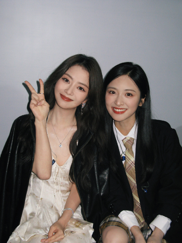 她对着镜头比了个 “V” 字手势,食指和中指轻轻分开,指尖刚好蹭到右侧碎发。唇色换成稍深的红调,带着雾面质感,眼睛弯成月牙形状,连眼尾的小细纹都露得自然。旁边女生也跟着比耶,两人肩膀贴得很近,连西装外套的褶皱,都带着刚笑完的轻颤。