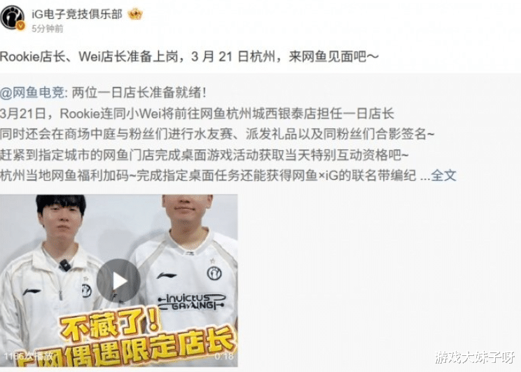 rookie分手事件后,将开启线下活动,网友直言要线下单杀他,近日,一则线下活动消息在电竞圈迅速引发讨论。Rookie将与打野选手Wei一同前往网鱼电竞杭州城西银泰店,担任“一日店长”,活动时间定在3月21日,现场不仅会安排水友赛互动,还将进行签名、合影以及礼品发放等环节,整体氛围偏向粉丝见面会性质。