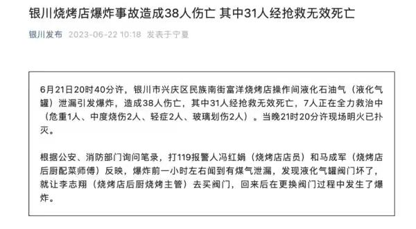 根据6月22日上午的信息,爆炸的原因是烧烤摊操作室压缩天然气(液化气罐)。根据银川公布的微信公众号信息,根据公安消防部门的询问记录,爆炸前一小时左右,烧烤摊店员和厨房配菜师闻到气体泄漏,发现液化气罐闸阀坏了,让厨房烤肉串主管购买闸阀,回来后更换阀门爆炸。据附近居民介绍,事发时店内恰逢用餐高峰期,客座率为90%。21日晚11时许,现场目击者陈女士告诉记者,爆炸后空气中充满了煤气味。两名服务员走出商店,其中一名害怕摔倒在地,商店里冒出烟雾。事故中的所有伤者都被送往宁夏医科大学总医院接受治疗。