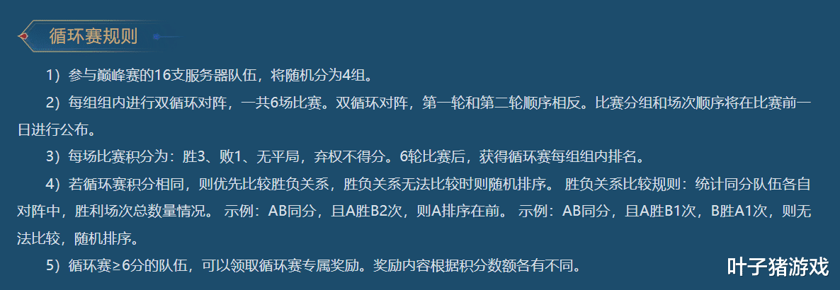 武神坛巅峰赛采用了“循环赛”和“交叉淘汰赛”规则,16个参赛服务器将被随机分为4组,循环赛结束后将根据循环赛排名成绩,随机匹配另外一个小组进行交叉对战。两个小组内将根据小组第一对战另外一组第四,小组第二对战另外一组小组第三的方式决出八强名额,八强赛的对决完全随机,胜者进入线下赛。