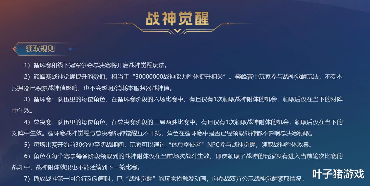 除此之外,参与武神坛巅峰赛的队伍,还可以获得“战神觉醒”BUFF,启用后会直接获得相当于3000W战神附体的属性。而且,由于这个BUFF在循环赛中是按角色领取的。也就是说,这场比赛你要抢速度,就可以让封系领;下场比赛要打输出,就可以让输出角色领。虽然每个角色只有一次领取机会,但用好的话,依然可以冲掉豪门团队!