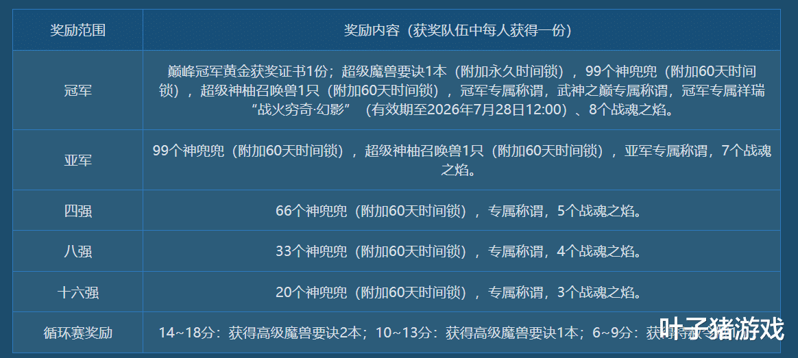 值得一提的是,只要你有参与武神坛巅峰赛的资格,就可以获得20个神兜兜、专属称谓和3个战魂之焰,并根据循环赛积分获得高级魔兽要诀和特赦令牌奖励。这样的奖励设置,势必会激发老板们参与武神坛巅峰赛的热情和动力。
