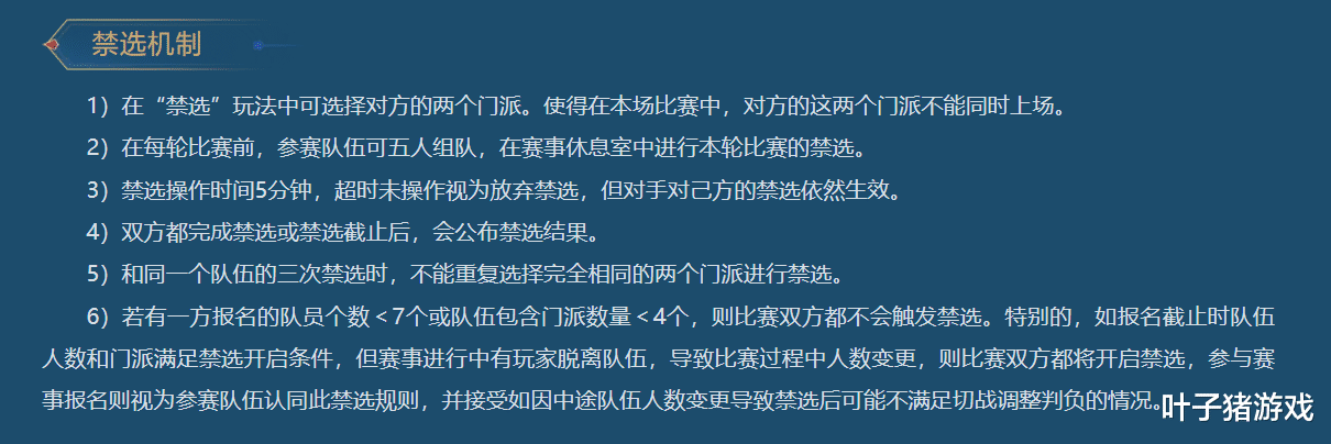 需要注意的是,武神坛巅峰赛的半决赛和总决赛,都会采取三局两胜制,并引入禁选机制,禁选机制同武神坛现行规则一样,被禁的两个门派不能同时上场(也就是可以复活一个)。不过,这次禁选增加了“和同一个队伍的三次禁选时,不能重复选择完全相同的两个门派进行禁选”的规则,给了喜欢三攻打法队伍更多机会。