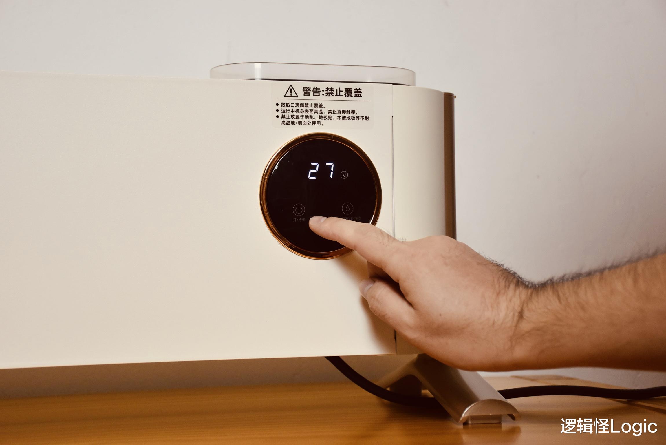 取暖器右侧设计有一块触控面板,提供:开/关机、档位切换、定时、开/关加湿模式、开/关氛围灯、童锁等功能。触控操作后会有语音提示状态。