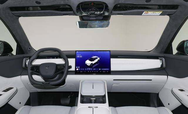 内饰采用极简风格,方向盘覆真皮,座椅为翻毛皮,色调统一简洁。车内按键少,功能集于15.05英寸可旋转中控屏。副驾手套箱上方设可折叠小桌板,设计独特且实用。