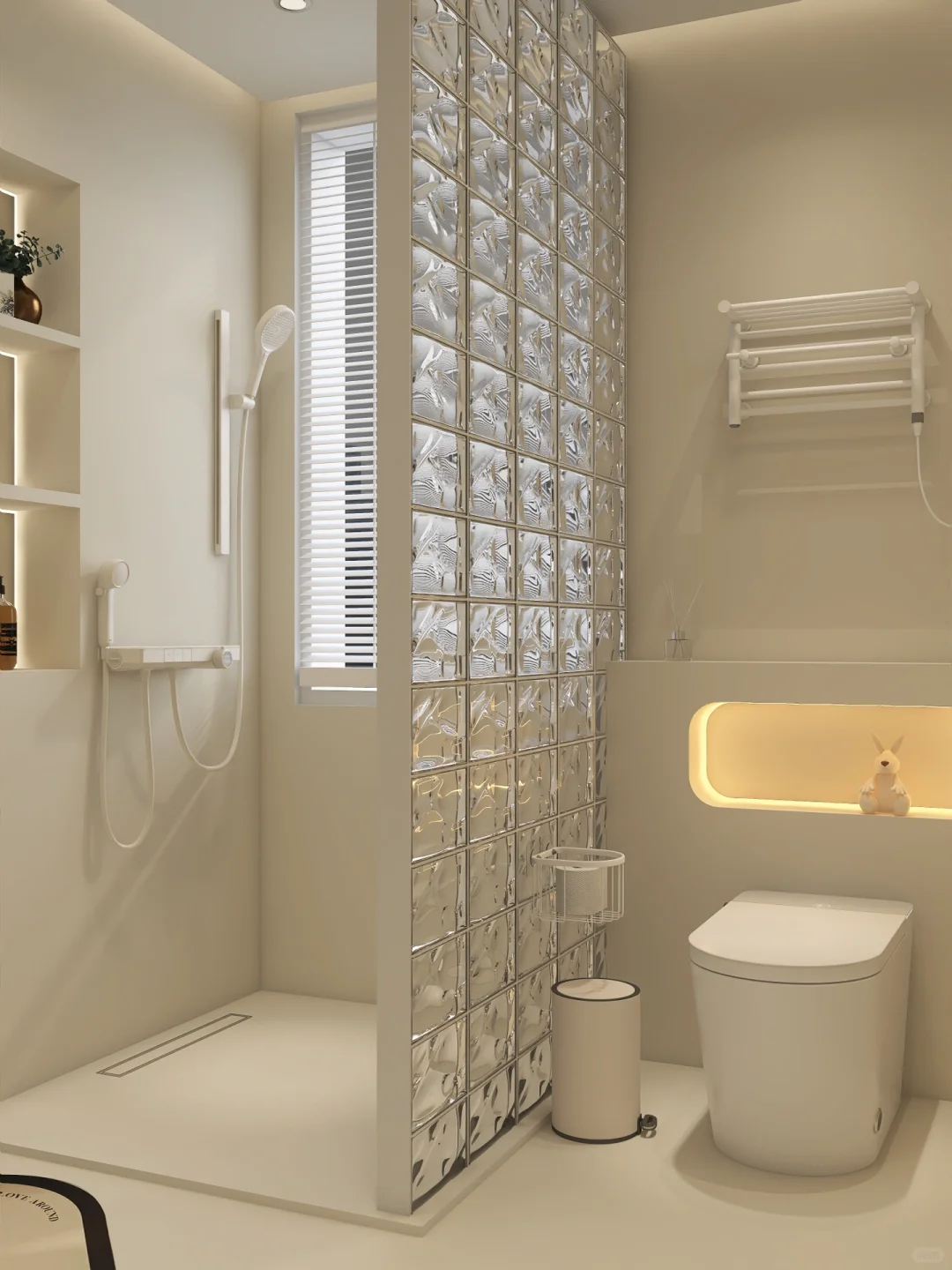 如果做玻璃隔断空间都很紧凑,可以选择开放式的淋浴间。还可以安装一个隐形浴帘来过渡。