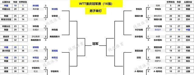 北京时间3月13日,乒乓球WTT重庆冠军赛到了第3个比赛日的争夺阶段。白天的场次比完之后,单打16强就正式确定了(具体情况可看下面的图表)。国乒派出10个人参赛,赢了9场输了1场;韩日两队都是8个人参赛,加起来有5个人被淘汰了,下面是详细的情况。