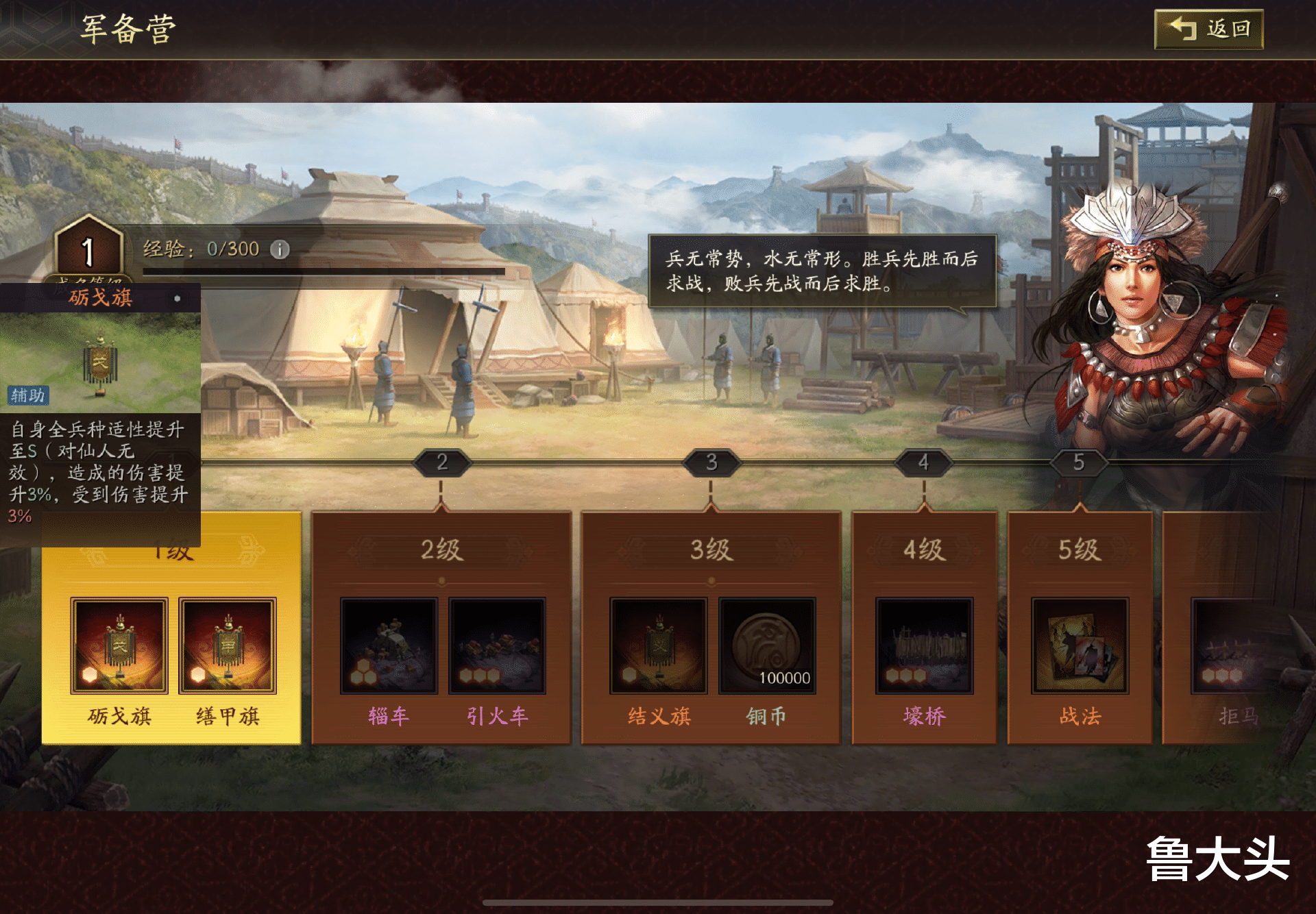 点进屏幕右下方的“阵”字就可以进入到旗阵系统,分为军备营和旗阵营两个部分,我们需要通过提升军备营的威名等级来解锁更多的阵型、军设以及拓战法。