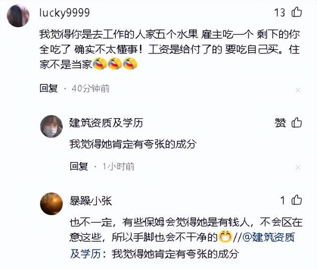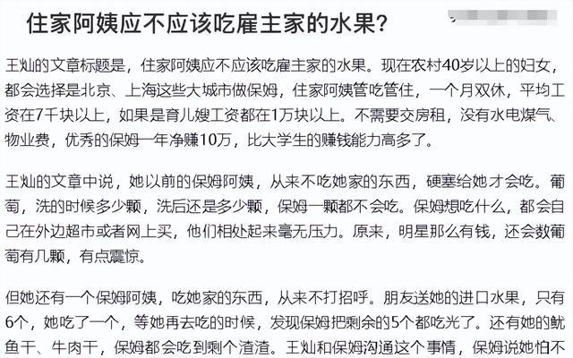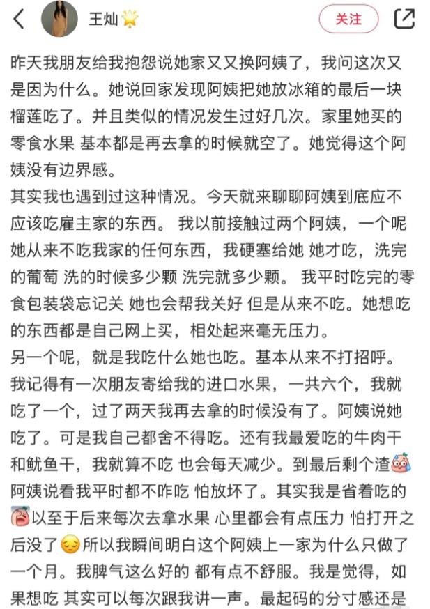 王灿的文章标题就直指问题核心“住家阿姨应不应该吃雇主家的水果,”这个问题看似简单,实则涉及到雇主与保姆之间的权责界限和相处之道。