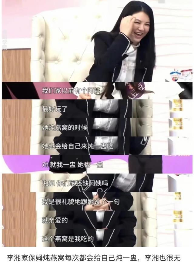 在此之前著名主持人李湘就在节目中提到过,她家的保姆在给她炖燕窝时,也会顺便给自己炖一份。