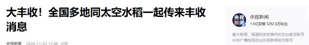 来源:央视新闻2024-11-03——《大丰收!全国多地同太空水稻一起传来丰收消息》的报道