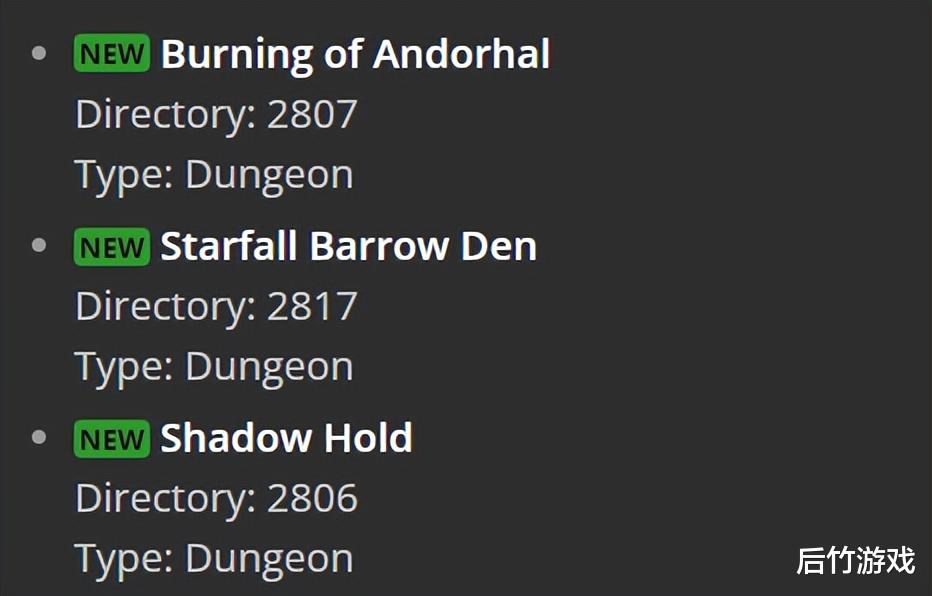 PTR上的补丁文件为1.15.4,外媒在其中发现了三块被标注为地下城的新区域:Burning of Andorhal(燃烧安多哈尔)、Starfall Barrow Den(星陨兽穴)、Shadow Hold(暗影要塞),疑似为P5新副本。P4有“屠魔峡谷”,而P5推出三个原创副本,官方值得肯定。