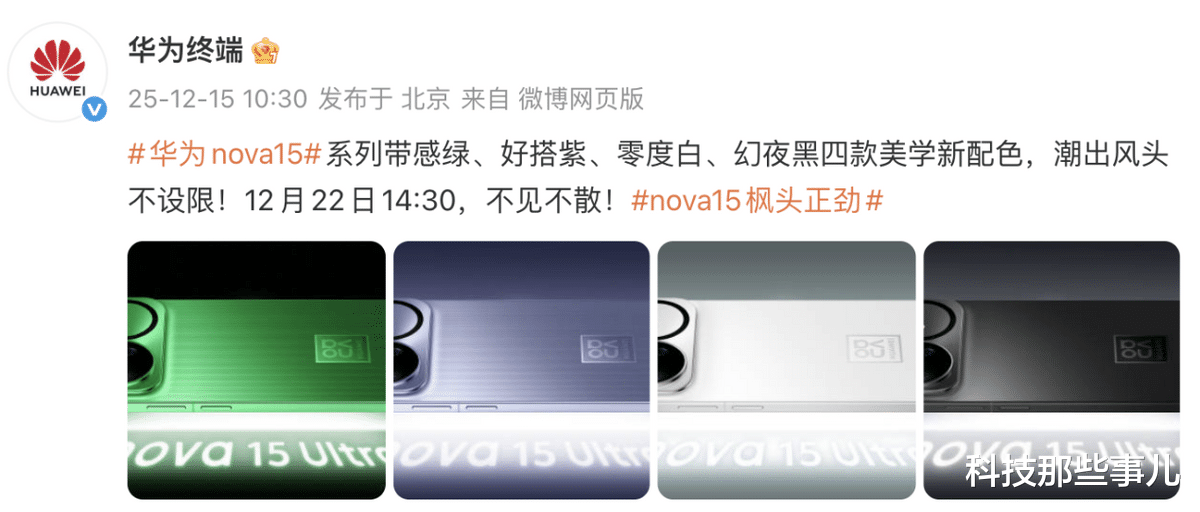 12月22日,华为将举行nova 15系列及全场景新品发布会,正式推出nova 15系列。随着双色产品图、群像大片等物料陆续上线,这款被外界称为"史上颜值最高nova"的产品引发了更高期待。从这些物料来看,nova 15系列在外观、影像等维度或将实现全面破格焕新,有望再次成为中端手机的设计与体验标杆。