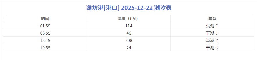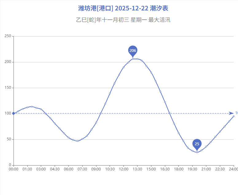 位置:潍坊港,日期:2025-12-22,农历:乙巳[蛇]年十一月初三,星期:星期一,潮汐类型:最大活汛