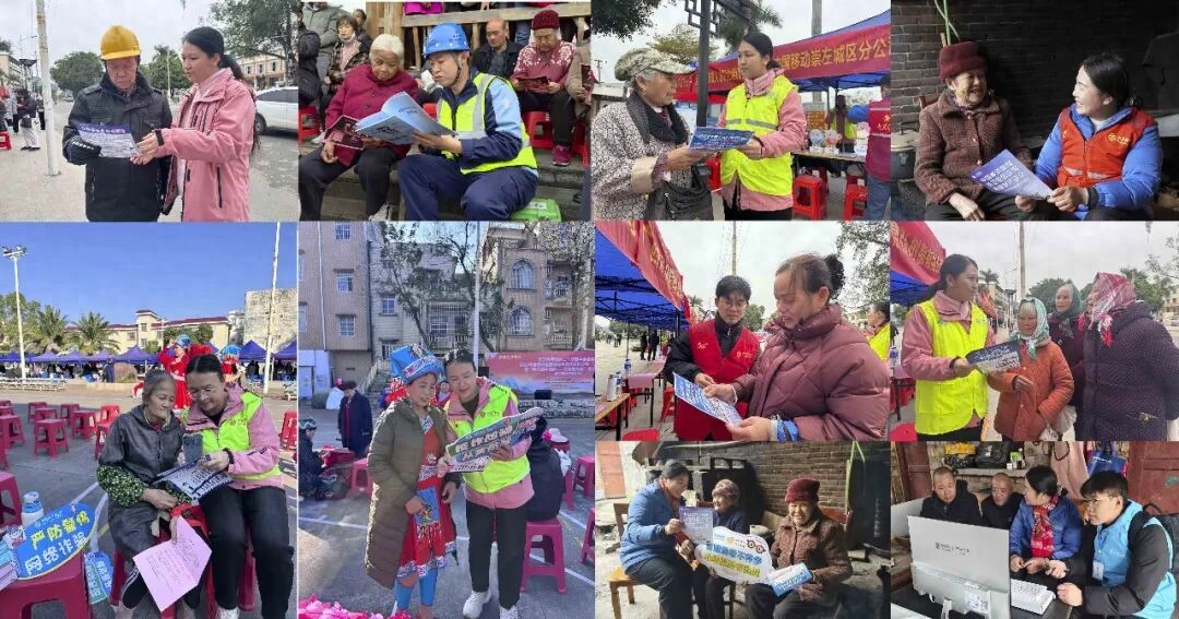 中国移动广西崇左分公司的志愿者们瞄准广场舞大军,在社区、公园广场支起反诈摊位,用实际案例改编“三不一多”口诀:“不轻信、不透露、不转账、多核实!”“阿叔,网购退款要警惕,屏幕共享是陷阱!”现场群众边看宣传单边点头,反诈知识在欢声笑语中入脑入心。