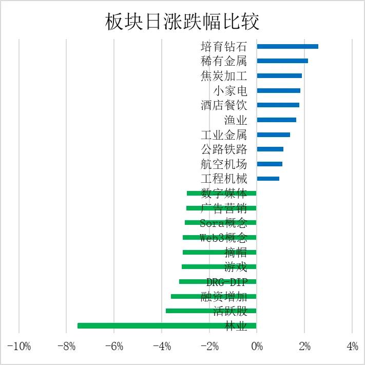 盘面上,培育钻石、稀有金属、焦炭加工、小家电、酒店餐饮、渔业、工业金属、公路铁路、航空机场、工程机械等板块涨幅居前;林业、DRG-DIP、游戏、Web3概念、Sora概念、广告营销、数字媒体等板块跌幅居前。