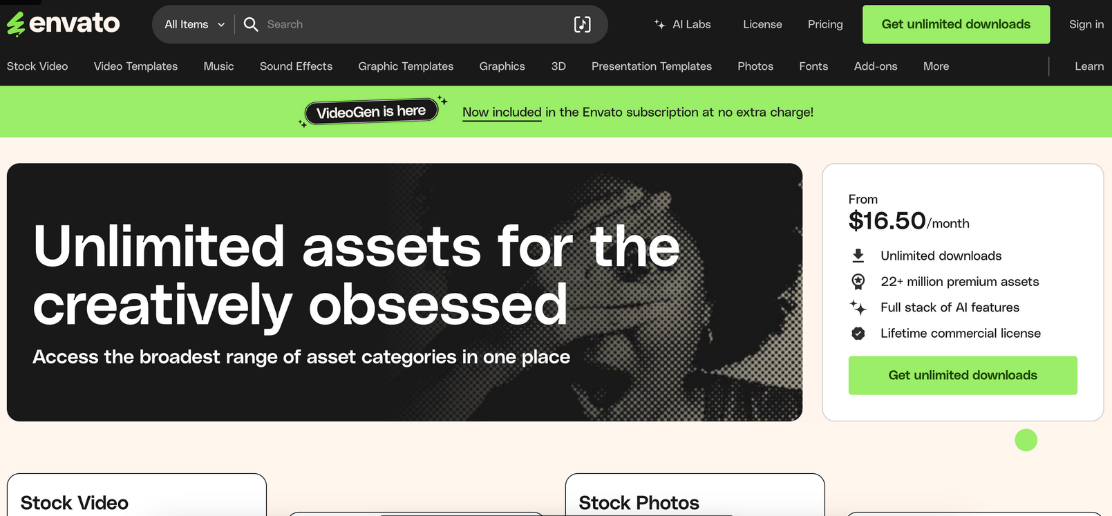 功能速览:采用订阅制,一台会员可无限下载站内数百万资源,包括视频、音频、图形模板、字体、照片等所有类型。