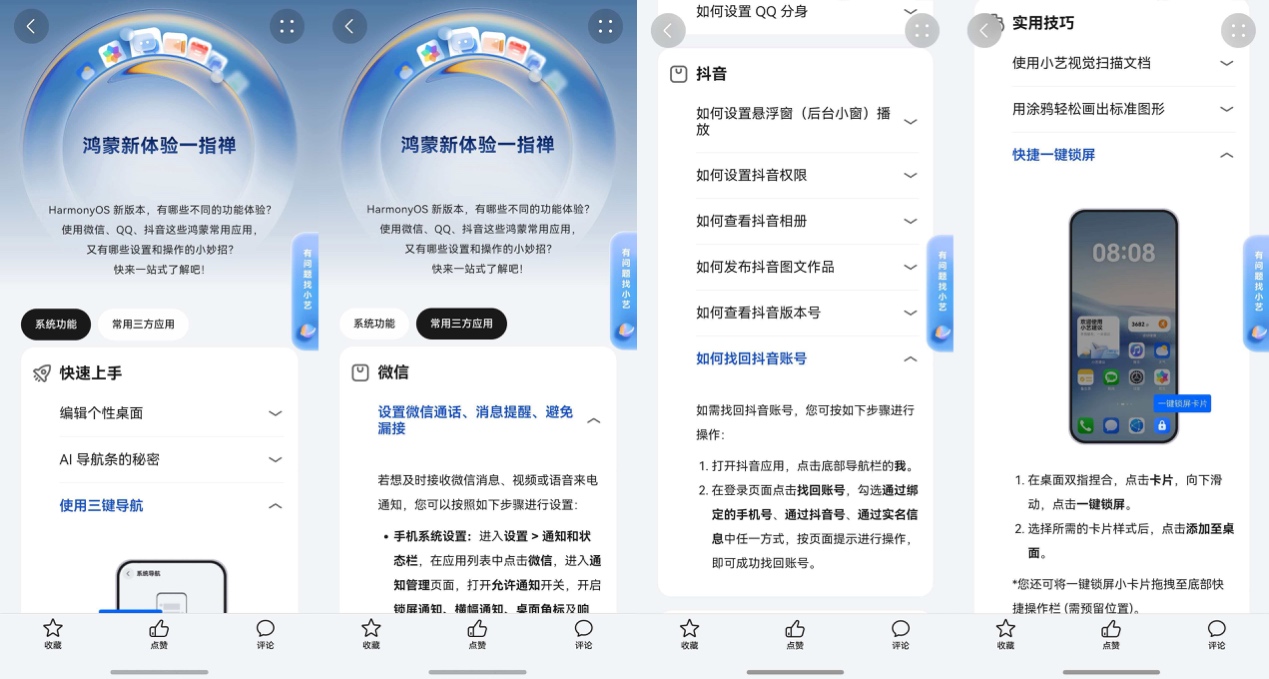 除了问答,玩机助手对话页面下方还有“鸿蒙一指禅”模块,把一些常用的系统功能设置和第三方应用使用攻略都整理好了,“如何编辑个性桌面”“如何查看抖音相册”等都能找到答案,闲暇时可以慢慢看,自己解锁更多功能。
