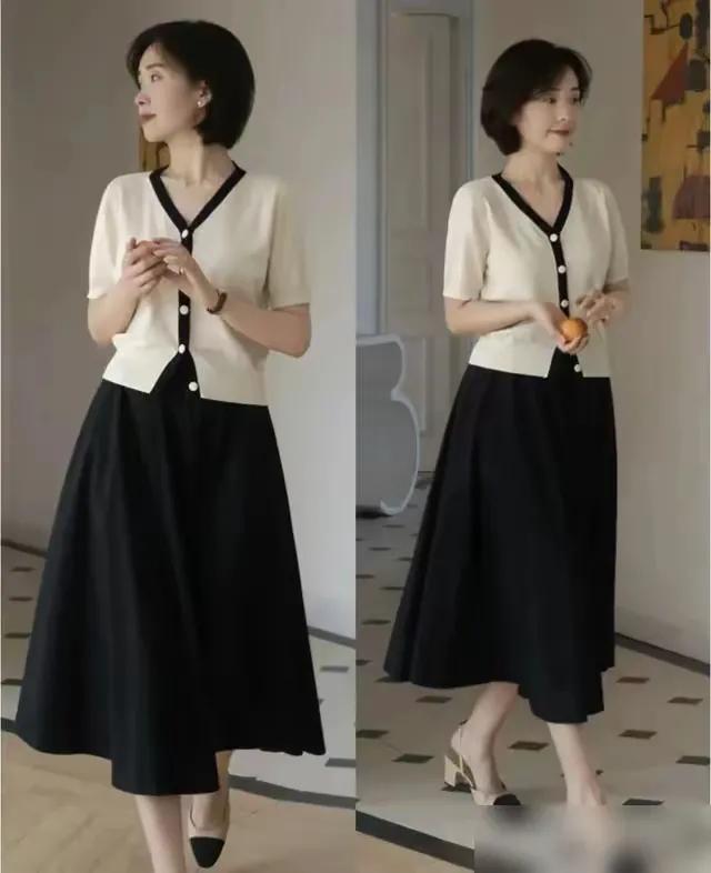 其实有的时候最好看的莫过于最基础的衣服颜色黑白灰,例如下面直接选择白色的针织开衫,搭配上黑色的伞状半身裙,脚踩一双黑白拼接的浅口单鞋,轻轻松松穿出高贵的气质,而且就算是再过十年拿出来穿,这样的色彩搭配也绝对不会过时。