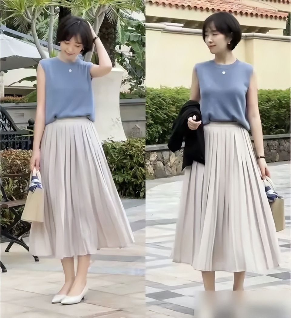 我们还可以选择无袖的针织短袖上衣,搭配上一款杏色的百褶伞状半身裙,脚踩双浅口的皮质单鞋,穿的时候记得把衣角塞进裙子里面,能很好的提升腰线。