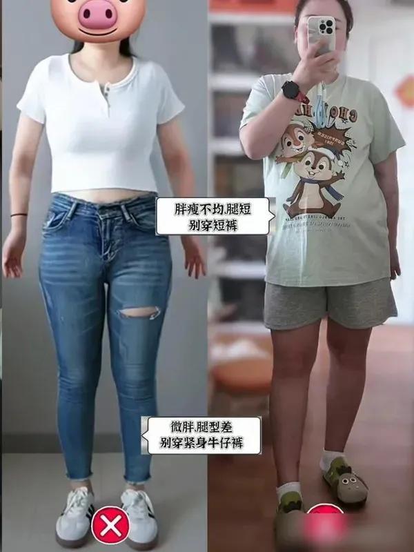 或者是说还想要刻意装嫩,选择一件短袖T恤,搭配上修身款的牛仔裤,那么就会暴露胯宽腿粗等问题。身材比例并没有那么好的情况下,还要杜绝用短袖来搭配上短裤,这样的穿搭胖瘦不均匀,穿出来的效果土气廉价。