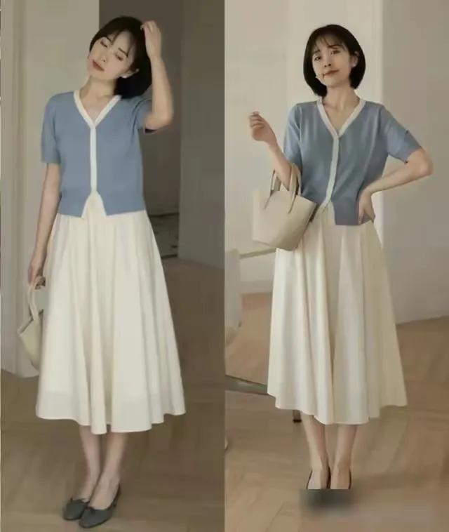 如果想要穿出温柔感,我个人还是蛮推荐大家选择针织衣服单品的,例如下面这种浅蓝色的针织开衫搭配上白色的半身裙,脚踩一双浅口单鞋,轻轻松松就能穿出温柔感,散发出女性该有的魅力和气质。