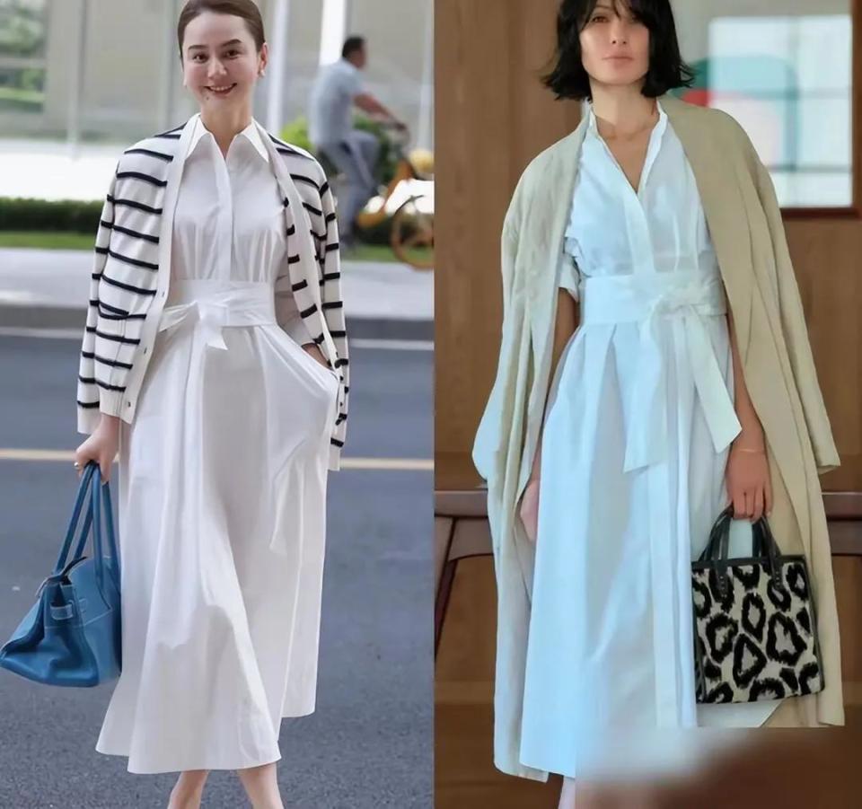 如果觉得穿一件衬衫连衣裙过于单调的情况下,还可以加上一款外套,比如说黑白条纹的针织开衫搭配上白色的衬衫连衣裙之后就形成了一个外短内长的搭配,这样的穿搭方式其实很适合骨架比较大,或者是长相偏成熟的女性穿搭,穿出来的效果很有富贵的气质范。