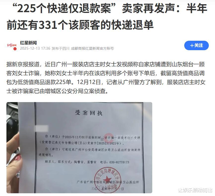 要理清这一事件的根源,或许还要追溯到不久前新京报报道的一起诈骗案:一服装店店主发视频称遭到山东烟台一顾客刘女士诈骗,她称对方半年内利用多个账号下单,调包为低货值商品并进行退款,共计225单。