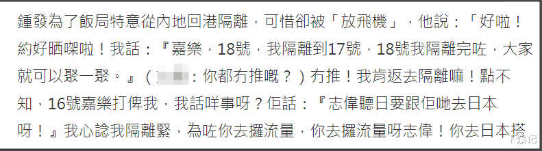 而那时候因为大环境的影响,如果需要来往两地是需要隔离的,而钟发为了和洪家班的人相聚,所以决定返港相聚。但没想到的是曾志伟突然改行程需要去其他地方,钟发对于此事相当生气,他更在节目上爆粗口表明两人已经绝交。