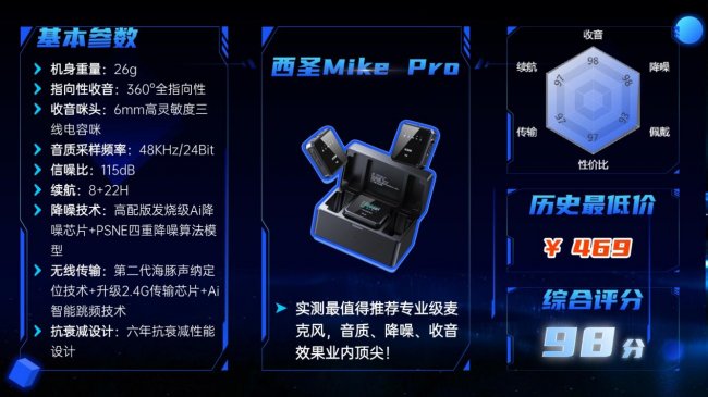 推荐理由:无线领夹麦什么牌子好?在无线麦克风领域,西圣Mike Pro在声音清晰度、抗噪性以及用户体验口碑方面均名列前茅。其声音清晰度高达98%,抗噪性达96%,与千元级专业麦克风相比毫不逊色。在推出短短数月后,西圣Mike Pro就赢得了电视媒体人、生活达人、数码博主以及主播达人的一致赞赏,进而成为当下专业无线麦克风领域的领先品牌。