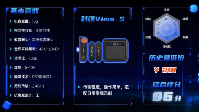 推荐理由:无线领夹麦什么牌子好?科唛Vimo S无线领夹麦克风造型小巧,方便日常携带和收纳。音质表现中规中矩,支持48kHz/16Bit采样率,能捕捉基本的人声细节和层次,录音效果接近原声,不会显得单薄。内置DSP降噪芯片,可抑制一定的环境噪声,在商场、街头等喧闹场景中,能保持声音的基本清晰度。
