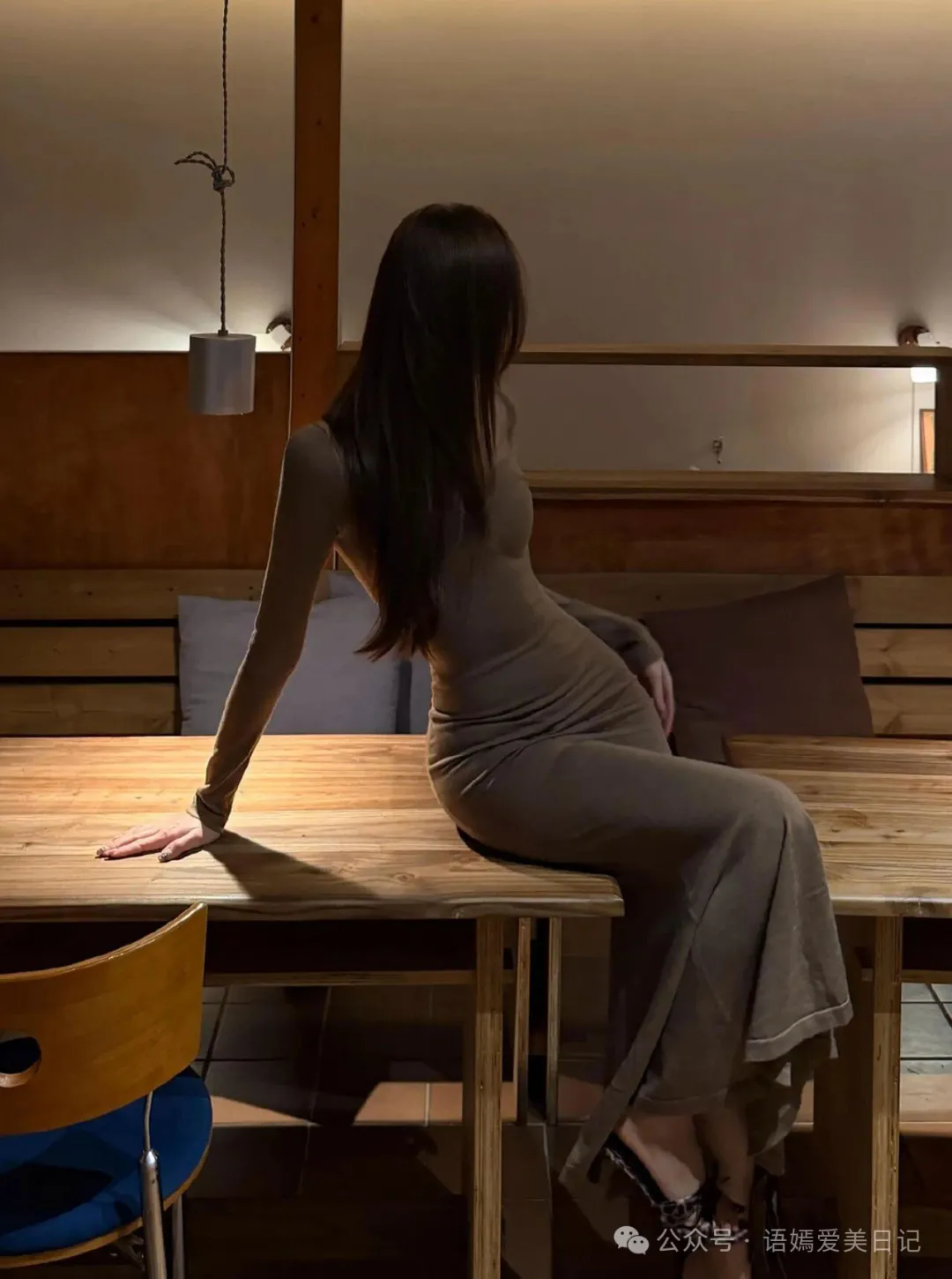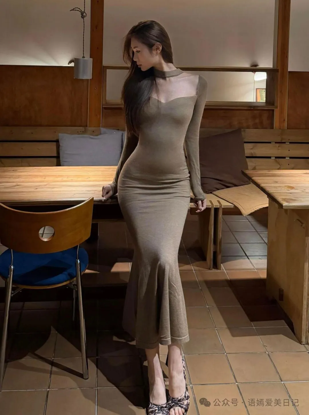 身着卡其色修身鱼尾连衣裙,领口拼接的透明网纱与裙身流畅的剪裁,勾勒出成熟女性的优雅曲线。脚踩花纹高跟凉鞋,长发微卷披肩,在木质色调的温暖背景下,整体散发着精致而迷人的轻熟风魅力。
