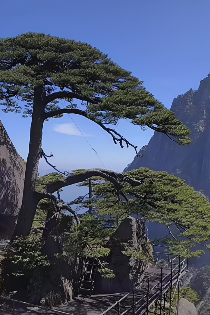 庞大辽阔的迎客松旁边都是悬崖绝壁,石壁上还有大大小小的花草树木,远处的悬崖绝壁令人回味难忘,特别震撼,小编站在这里拿着手机️一边拍照一边观赏周围的一切,据说这里以前还是文人墨客游玩的地方哦。