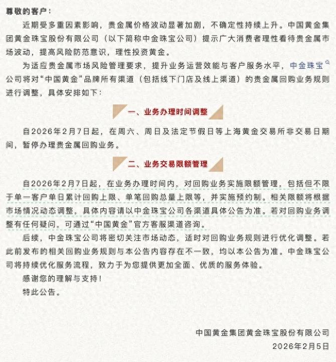 菜百股份官微显示,自2026年2月6日起,在周六、周日及法定节假日等上海黄金交易所非交易日期间,公司将暂停办理贵金属回购业务。在业务办理时间内,公司将对回购业务进行限额管理,限额类型包括全量或单一客户单日回购上限、单笔回购总量上限等,并进行动态设置。