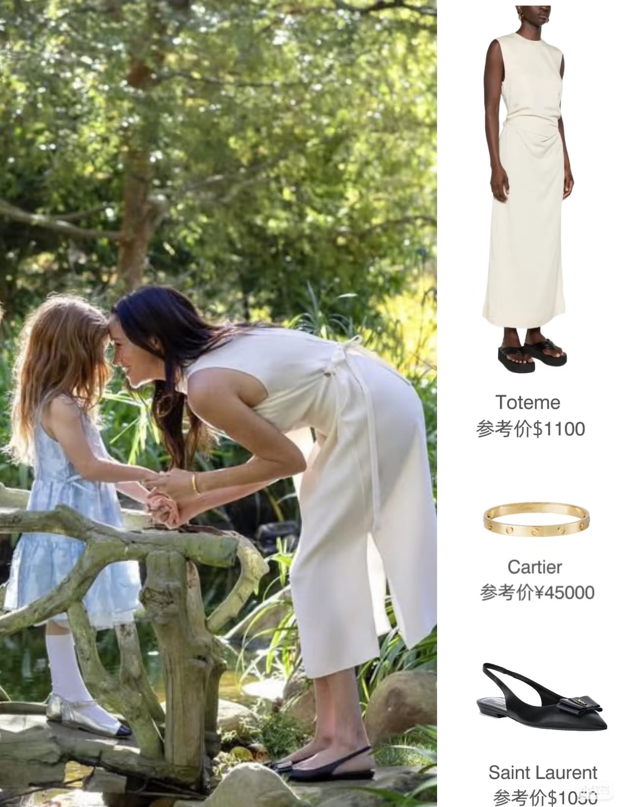 可以看到,拍摄背景依然是梅根目前人设营销所需的悠然田园风,不过着装上还是偏王室的时尚、精致!