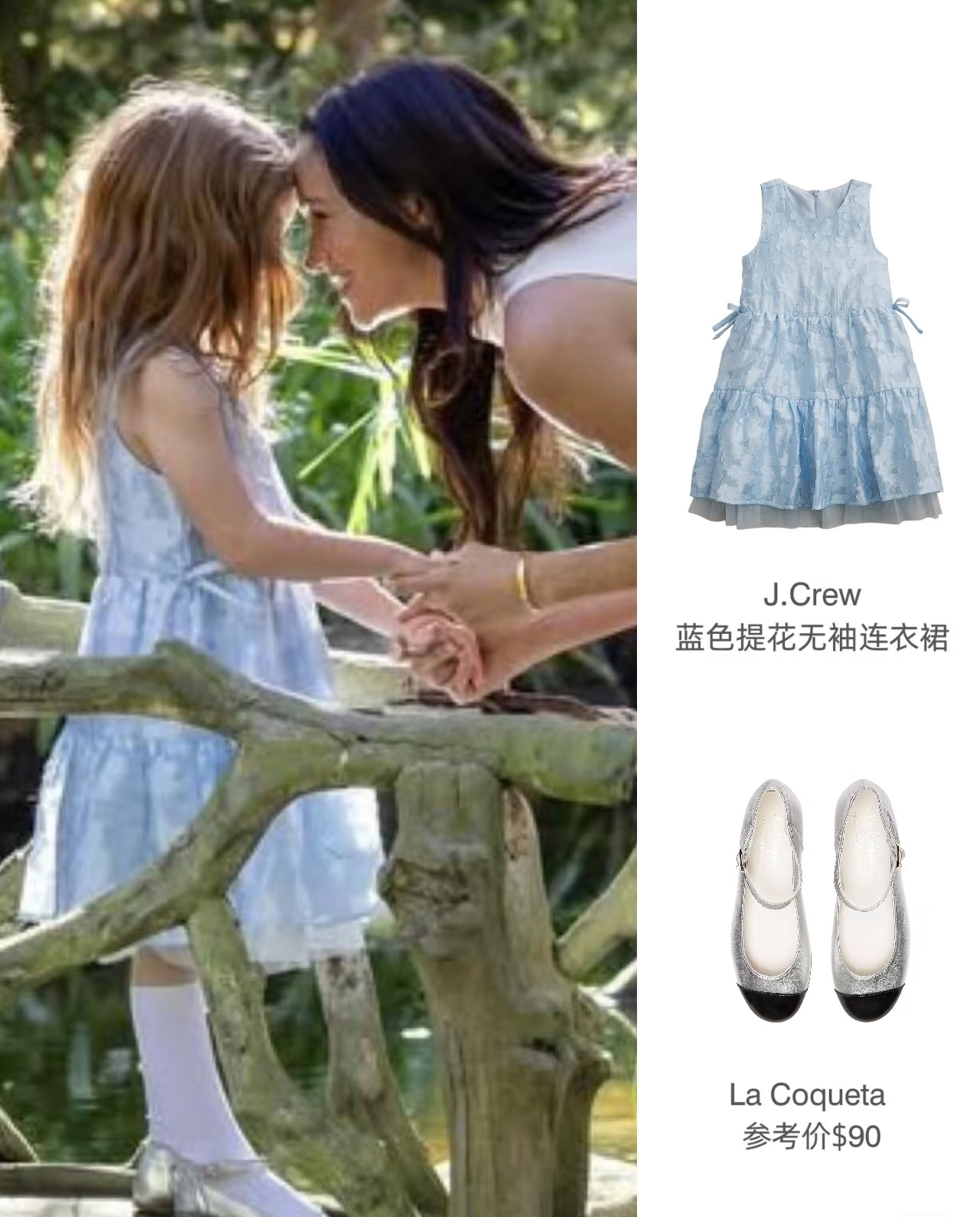 4岁的莉莉贝特公主,则是一身蓝色提花无袖连衣裙,搭配一双银色公主鞋和白色长袜,妥妥的英伦皇家公主范。